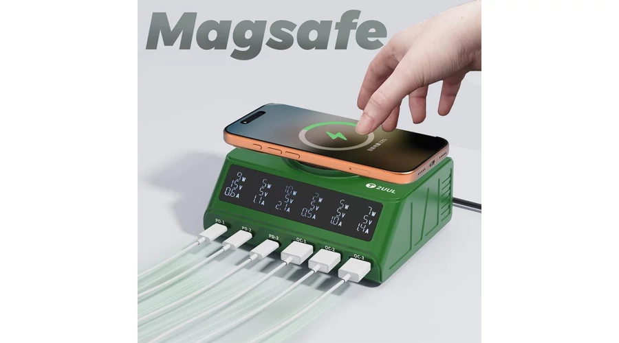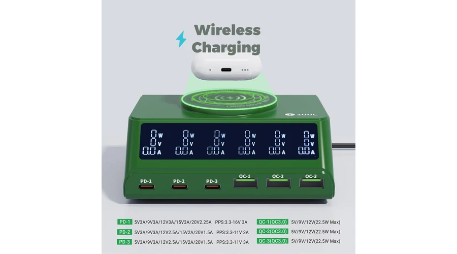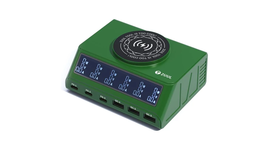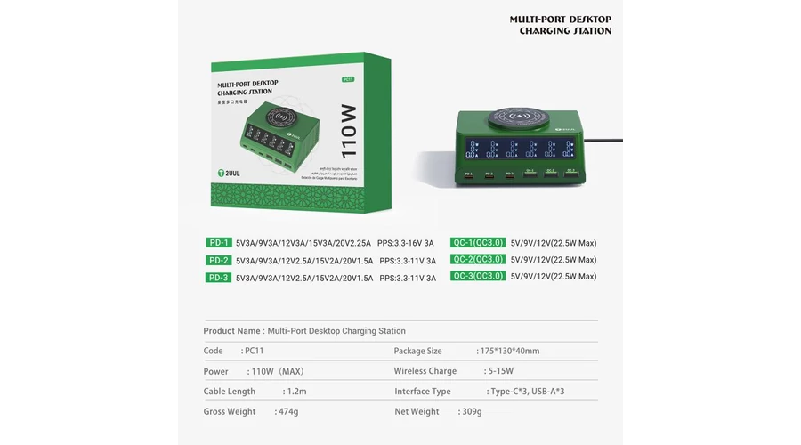 2UUL PC11, 110W-os többportos PD + QC többportos asztali töltőállomás 15W-os vezeték nélküli töltővel