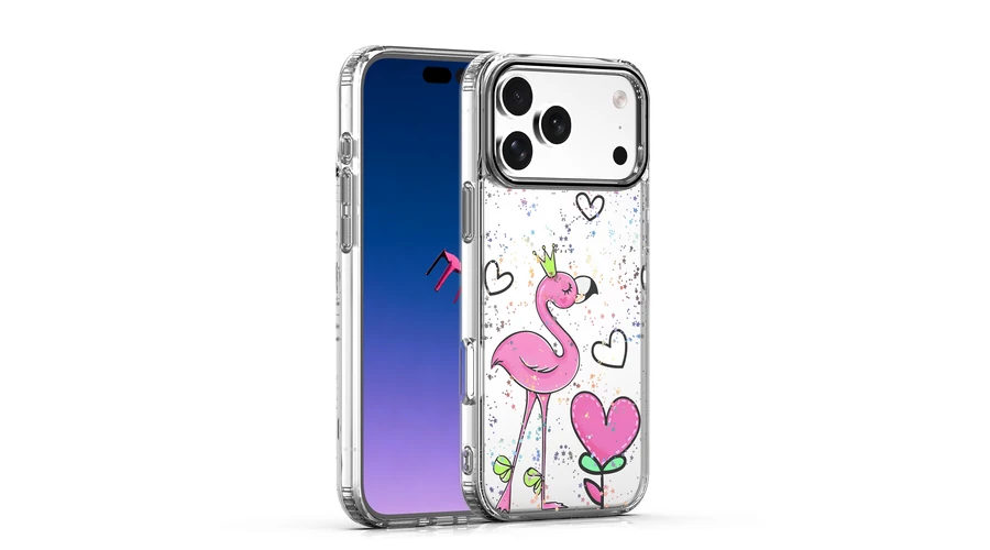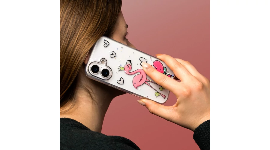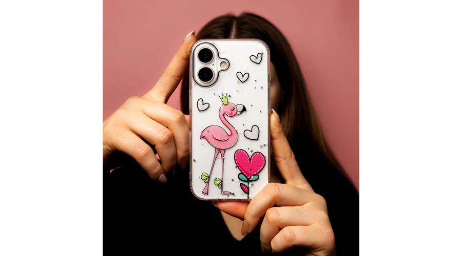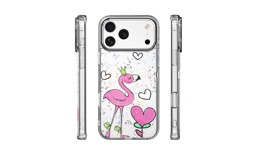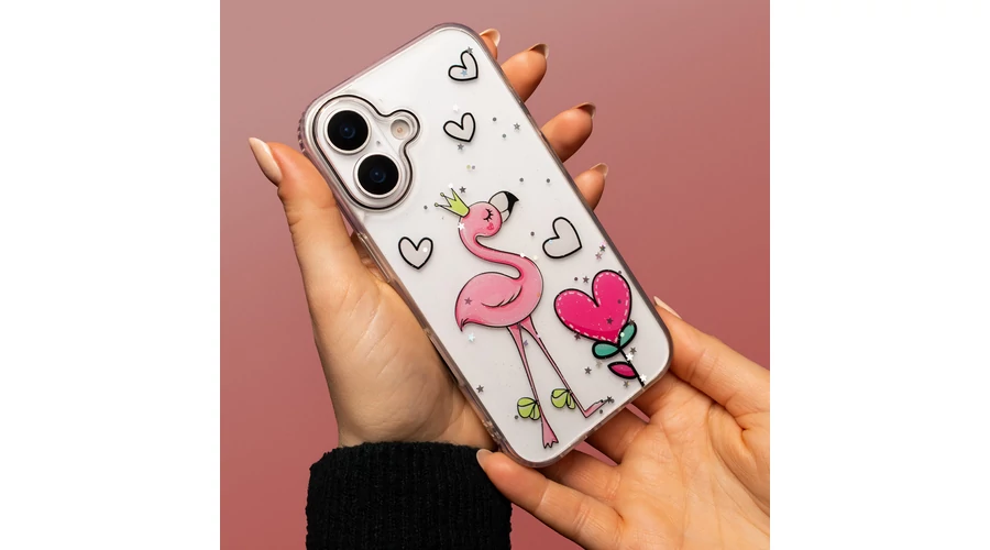 . A romantikus szív és a játékos flamingó motívumok kopás- és fakulásálló módon vannak felhordva.