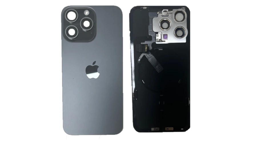 Apple iPhone 16 Pro, Akkufedél, kamera lencsével, mágneses gyűrűvel, vezeték nélküli töltőchippel és vakuval, szerelt, fekete, Black Titanium