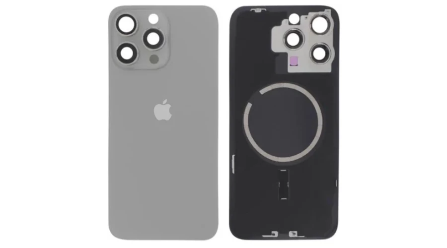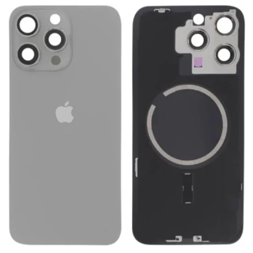 Apple iPhone 16 Pro, Akkufedél, kamera lencsével, mágneses gyűrűvel, vezeték nélküli töltőchippel és vakuval, szerelt, szürke, Natural Titanium