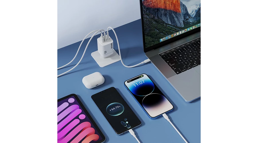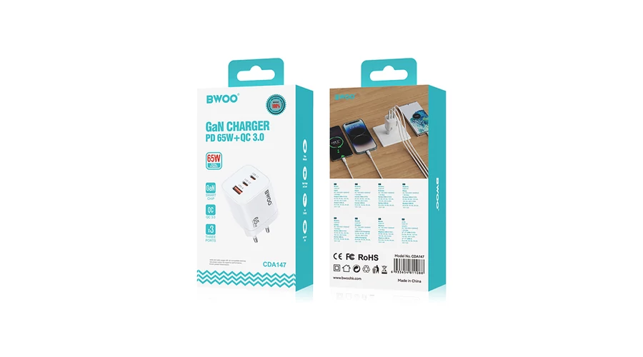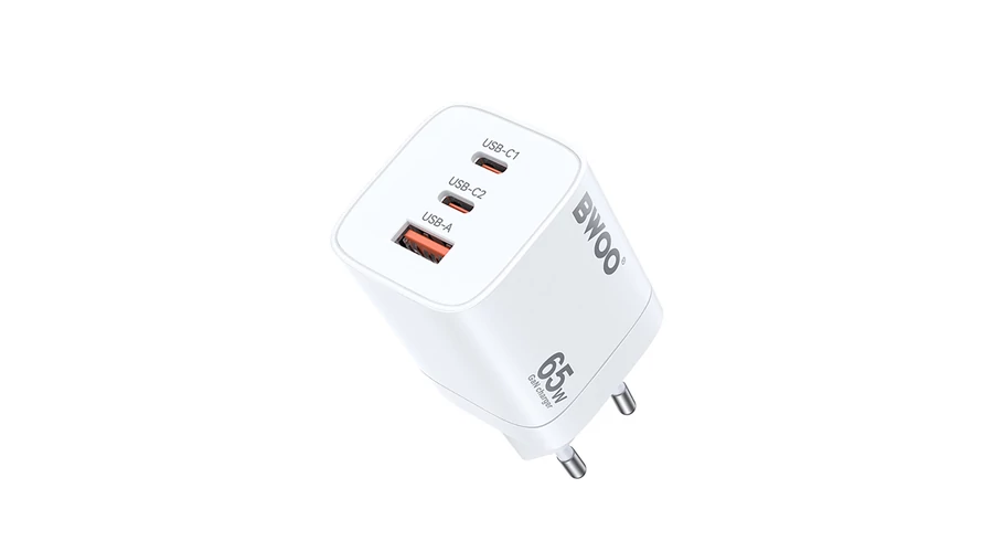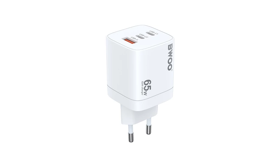 BWOO CDA147 PD+ QC 3.0 65W 1XUSB-A + 2XUSB-C, Hálózati gyorstöltő, fehér
