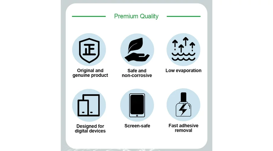 - 【Hatékony ragasztóeltávolítás】Kifejezetten LCD javításhoz tervezett nagy teljesítményű folyadék, amely biztosítja a ragasztók gyors és hatékony eltávolítását a kijelző felületének károsítása nélkül.