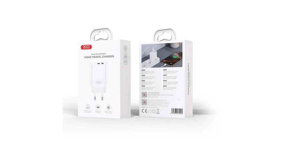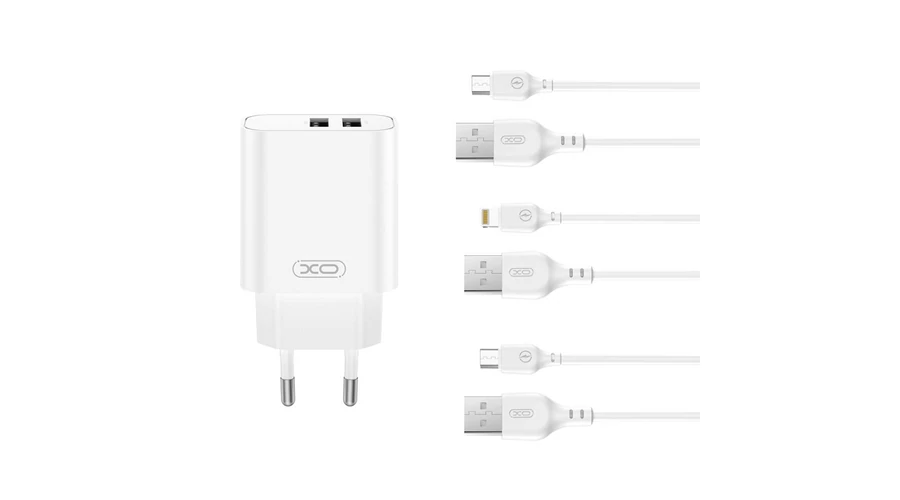 XO CE34, 2XUSB-A 2,4A 12W Hálózati gyorstöltő (+Type C kábel), fehér